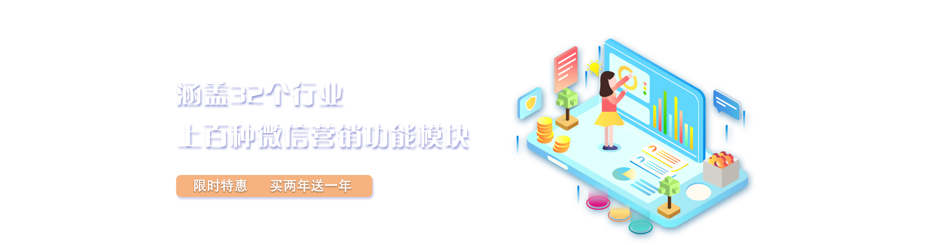 全部营销功能模块 部分可用       投票、抢购、抽奖、二维码红包等上百项微信营销功能,扫码点餐、微信门禁、现场大屏幕等多个行业应用无限制使用   查看全部功能介绍>>>